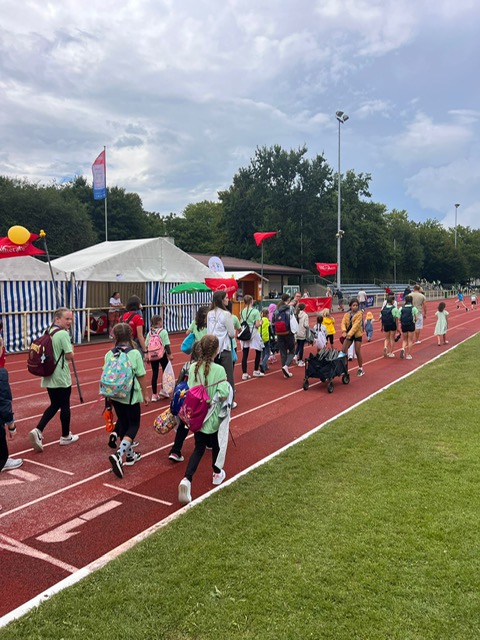 Während die Kinder sich einrichteten, kümmerten sich unsere Betreuer um die personalisierten Turnfest-T-Shirts und verteilten sie an die stolzen Besitzer. Neu in diesem Jahr: unser farbenfrohes Fahnen- und Luftballon-Konzept. Jedes Kind wurde bei der Ankunft einer Betreuergruppe zugeteilt, die durch bunte Luftballons gekennzeichnet war – eine fröhliche Idee, die für Struktur und gute Laune sorgte.