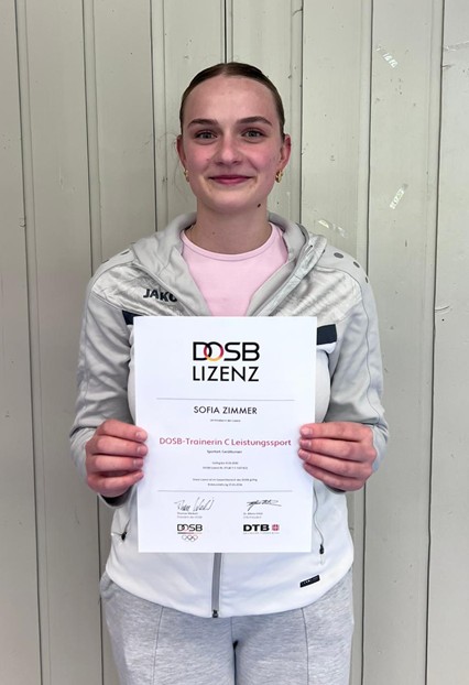 Wir gratulieren Sofia Zimmer zur bestandenen Prüfung für die Übungsleiter C-Lizenz Leistungssport im Gerätturnen. Die Ausbildung besteht aus drei Modulen, wobei die ersten zwei Online gelehrt werden. Sofia bekam bei ihrem Arbeitgeber Bildungsurlaub genehmigt und konnte sich so auf der Sportschule Schöneck in Karlsruhe gut auf den einwöchigen Prüfungslehrgang vorbereiten. Zurzeit trainiert Sofia die Mädels der Gauliga-Mannschaften und ist seit diesem Jahr auch unsere Jugendleiterin. Damit erweitert sich unser Trainerstab um eine weitere kompetente Übungsleiterin.